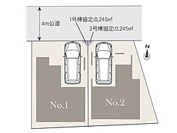 高度地区、22条区域、1種4-2.5時間(4m) 越境解消ないしは覚書取得、協定面積約0.245平米有、1F車庫面積:(1)8.17平米・(2)10.55平米