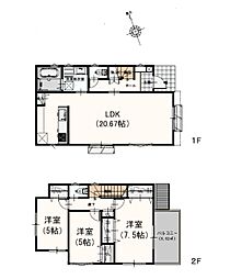 間取り内訳:リビングダイニングキッチン 16帖(1階)・洋室 4.5帖(2階)・洋室 5.3帖(2階)・洋室 5.7帖(2階)・洋室 8帖(2階)