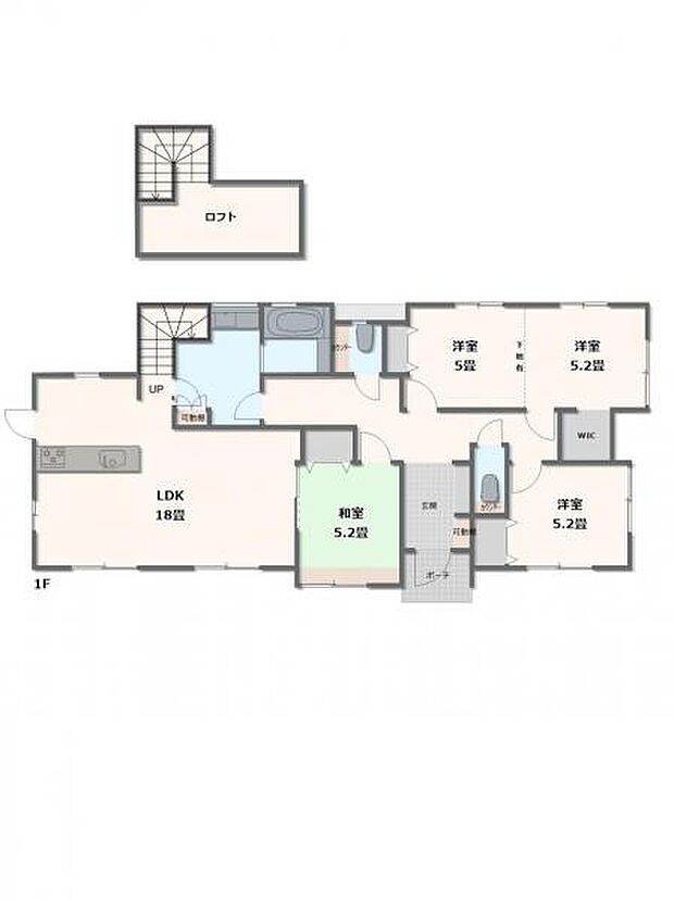 間取り内訳:リビングダイニングキッチン 18帖(1階)・和室 5.2畳(1階)・洋室(1階)・洋室 5.2帖(2階)