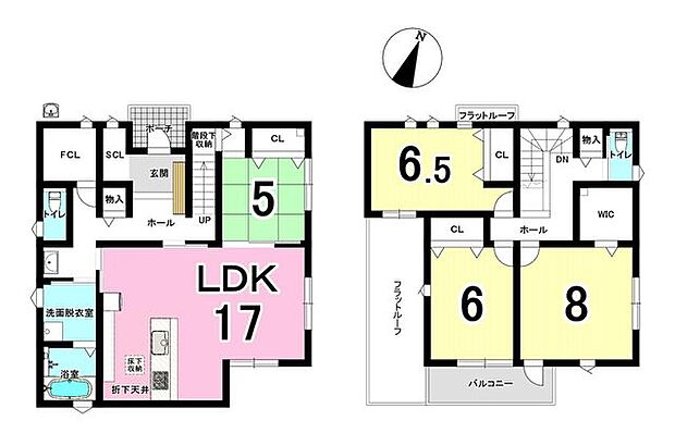 間取り内訳:リビングダイニングキッチン 17帖(1階)・和室 5畳(1階)・洋室 6帖(2階)・洋室 6.5帖(2階)・洋室 8帖(2階)