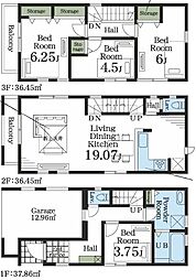 | 間取り | 4LDK 間取り内訳:洋室 3.7帖(1階)・リビングダイニングキッチン 19帖(2階)・洋室 6.2帖(3階)・洋室 6帖(3階)・洋室 4.5帖(3階) |