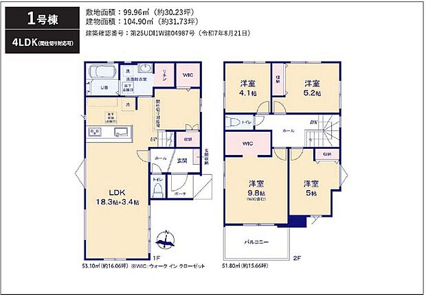 | 間取り | 4LDK(LDKは間仕切り対応可能) 間取り内訳:リビングダイニングキッチン 21.7帖(1階)・洋室 5帖(2階)・洋室 9.8帖(2階)・洋室 4.1帖(2階)・洋室 5.2帖(2階) |