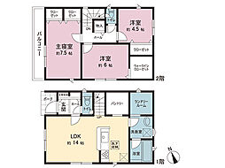| 間取り | 3LDK 間取り内訳:リビングダイニングキッチン 14帖(1階)・洋室 7.5帖(2階)・洋室 6帖(2階)・洋室 4.5帖(2階) |