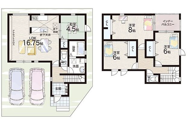 • 「建築条件付き土地」の「建物プラン例」は、土地購入者の設計プランの一例であり、プランの採用可否は任意です。