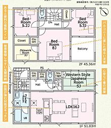| 間取り | 3LDK 間取り内訳:リビングダイニングキッチン 17帖(1階)・洋室 7.5帖(2階)・洋室 6.5帖(2階)・洋室 5.2帖(2階) |