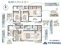 | 間取り | 4LDK 間取り内訳:リビングダイニングキッチン 16帖(1階)・和室 4.5畳(1階)・洋室 7.5帖(2階)・洋室 5.2帖(2階)x2・洋室 |