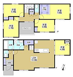 | 間取り | 4LDK 間取り内訳:リビングダイニングキッチン 15.8帖(1階)・洋室 8帖(2階)・洋室 5.3帖(2階)x2・洋室 5帖(2階)・洋室 5.3帖(1階)・収納 3帖(2階) |