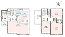間取り内訳:リビングダイニングキッチン 19帖(1階)・洋室 8.5帖(2階)・洋室 6帖(2階)・洋室 6帖(2階)
