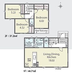 間取り内訳:リビングダイニングキッチン 18帖(1階)・洋室 6帖(2階)・洋室 5.2帖(2階)・洋室 4.5帖(2階)