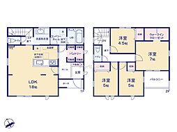 間取り内訳:リビングダイニングキッチン 16帖(1階)・洋室 4.5帖(1階)・洋室 7帖(2階)・洋室 5.2帖(2階)x2・収納(2階)