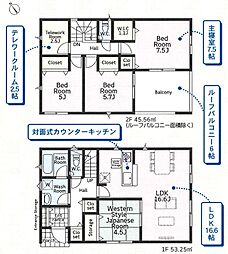 | 間取り | 4LDK(ウォークインクローゼット、パントリー、ランドリールーム) 間取り内訳:リビングダイニングキッチン 18.5帖(1階)・和室 4.5畳(1階)・洋室 7.5帖(1階)・洋室 6.5帖(1階)・洋室 4.5帖(1階) |