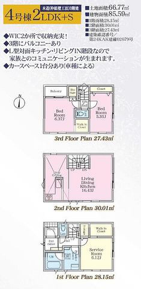 | 間取り | 2SLDK 間取り内訳:収納 6.1帖(1階)・リビングダイニングキッチン 16.4帖(2階)・洋室 6.3帖(3階)・洋室 5.3帖(3階) |