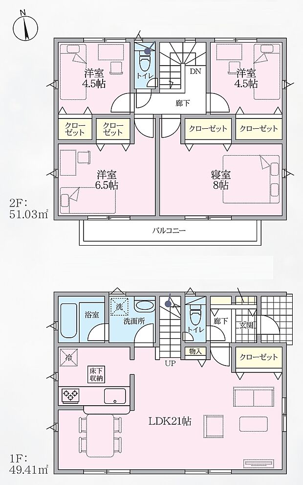 | 間取り | 4LDK(4LDK) 間取り内訳:リビングダイニングキッチン 21帖(1階)・洋室 8帖(2階)・洋室 6.5帖(2階)・洋室 4.5帖(2階)x2 |