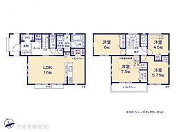 | 間取り | 4LDK(18.0畳) 間取り内訳:リビングダイニングキッチン 18帖(1階)・洋室 7.5帖(2階)・洋室 5.3帖(2階)・洋室 5.3帖(2階)・洋室 5.3帖(2階) |