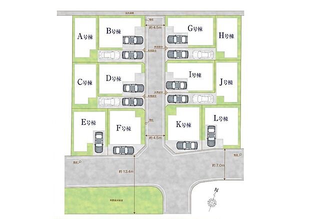 C号棟:東4.5m /E号棟:南13.4m /I号棟:西4.5m /D号棟:東4.5m /F号棟:南13.4m 東4.5m /G号棟:西4.5m /H号棟:西4.5m …他