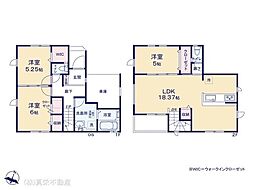 | 間取り | 3LDK 間取り内訳:洋室 6帖(1階)・洋室 5.2帖(1階)・リビングダイニングキッチン 18.3帖(2階)・洋室 5帖(2階) |