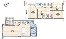 | 間取り | 3LDK 間取り内訳:リビングダイニングキッチン 16帖(1階)・洋室 12帖(2階)・洋室 5帖(2階)x2 |