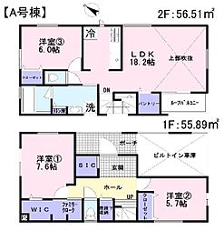 間取り内訳:洋室 7.6帖(1階)・洋室 5.7帖(1階)・リビングダイニングキッチン 18.2帖(2階)・洋室 6帖(2階)