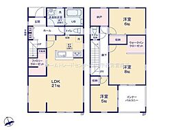 | 間取り | 3LDK 間取り内訳:リビングダイニングキッチン 21帖(1階)・洋室 8帖(2階)・洋室 6帖(2階)・洋室 5帖(2階) |