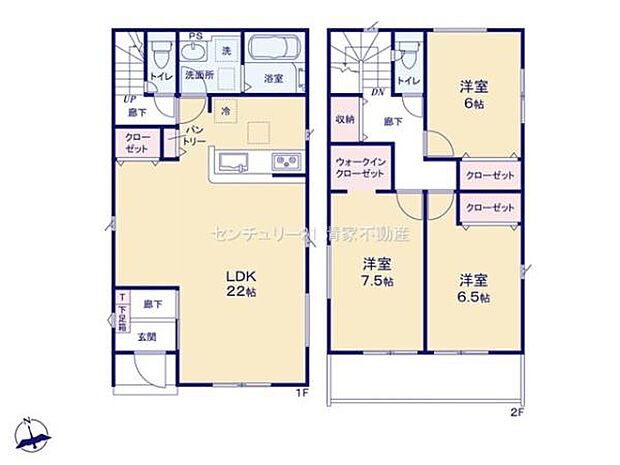 | 間取り | 3LDK 間取り内訳:リビングダイニングキッチン 22帖(1階)・洋室 7.5帖(2階)・洋室 6.5帖(2階)・洋室 6帖(2階) |