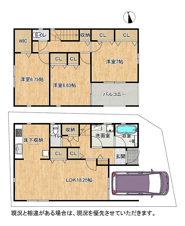 | 間取り | 3LDK 間取り内訳:リビングダイニングキッチン 18.2帖(1階)・洋室 7帖(2階)・洋室 6.7帖(2階)・洋室 6.6帖(2階) |