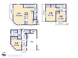 | 間取り | 3LDK 間取り内訳:洋室 4帖(1階)・リビングダイニングキッチン 16.3帖(2階)・洋室 6.1帖(3階)・洋室 4.1帖(3階) |