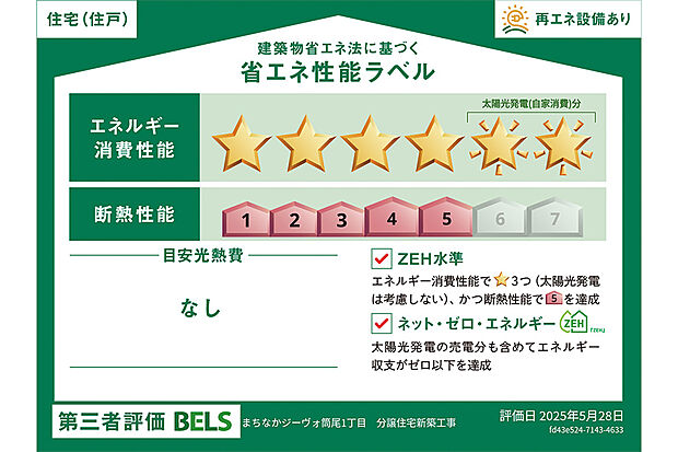 星マークの数が多いほどエネルギー消費性能が高いことを示しています。再エネ設備のない住宅は★0~★4の5段階評価、再エネ設備がある住宅は★0~★6の7段階評価となります。