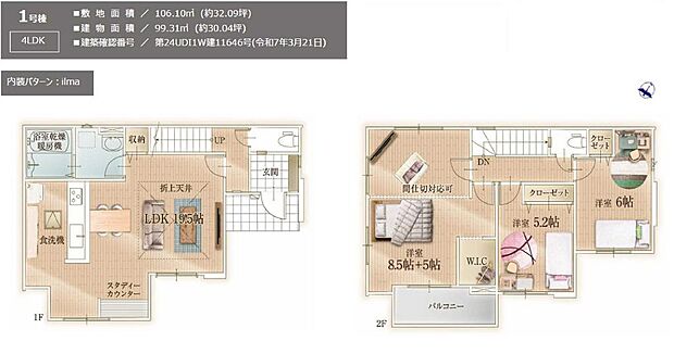 | 間取り | 3LDK(2階13.5帖の洋室は間仕切り対応可能) 間取り内訳:リビングダイニングキッチン 19.5帖(1階)・洋室 6帖(2階)・洋室 5.2帖(2階)・洋室 13.5帖(2階) |