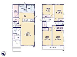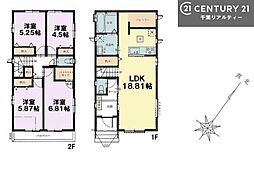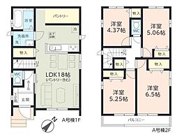 間取り内訳:リビングダイニングキッチン 18.5帖(1階)・洋室 6.7帖(2階)・洋室 5.1帖(2階)・洋室 5.1帖(2階)・洋室 4.7帖(2階)