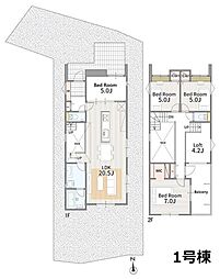 間取り内訳:リビングダイニングキッチン 20帖(1階)・洋室 8.5帖(2階)・洋室 8帖(2階)・洋室 5.2帖(2階)