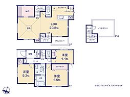 | 間取り | 4SLDK 間取り内訳:リビングダイニングキッチン 18帖(1階)・洋室 5.3帖(2階)x3・和室 7.1畳(2階) |