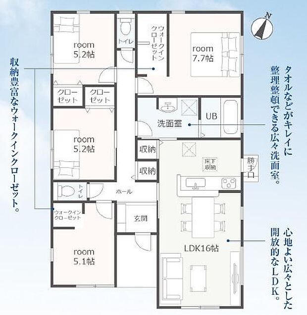 | 間取り | 4LDK 間取り内訳:リビングダイニングキッチン 16帖(1階)・洋室 7.7帖(1階)・洋室 5.2帖(1階)・洋室 5.1帖(1階)・洋室 5.2帖(1階) |