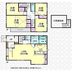 間取り内訳:リビングダイニングキッチン 20.4帖(1階)・洋室 9帖(2階)・洋室 5.5帖(2階)・洋室 5.4帖(2階)・洋室 4帖(2階)
