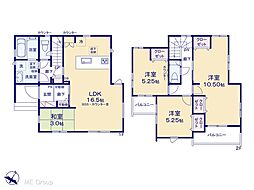 間取り内訳:洋室 5.2帖(2階)・洋室 10.5帖(2階)・リビングダイニングキッチン 16.5帖(1階)・洋室 5.2帖(2階)