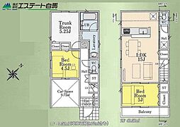 間取り内訳:洋室 4.5帖(1階)・収納 5.2帖(1階)・洋室 5帖(2階)・リビングダイニングキッチン 15帖(2階)