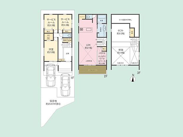 | 間取り | 1SLDK 間取り内訳:収納 5.3帖(1階)・収納 5.3帖(1階)・洋室 7帖(1階)・リビングダイニングキッチン 21帖(2階)・その他 8.2帖(2階) |