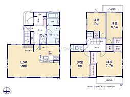 間取り内訳:リビングダイニングキッチン 20帖(1階)・洋室 7.7帖(2階)・洋室 6帖(2階)・洋室 5.5帖(2階)・洋室 5帖(2階)