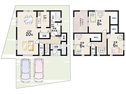 • 二階建ての間取りで各階に和室と洋室があり使い分けしやすい設計です。収納スペースが充実しており各部屋に収納スペースを備えています。広々としたLDKが一階に設けられており生活動線が分かりやすい配置です。