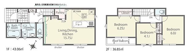 間取り内訳:洋室 6.2帖(2階)・洋室 6帖(2階)・洋室 4.1帖(2階)・リビングダイニングキッチン 15.7帖(1階)
