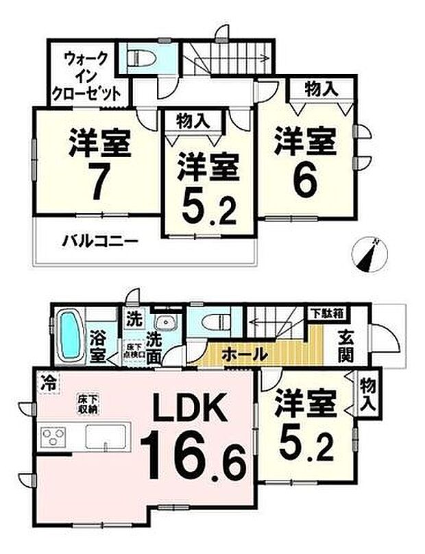| 間取り | 4LDK 間取り内訳:リビングダイニングキッチン 16.6帖(1階)・洋室 5.2帖(1階)・洋室 7帖(2階)・洋室 6帖(2階)・洋室 5.2帖(2階) |