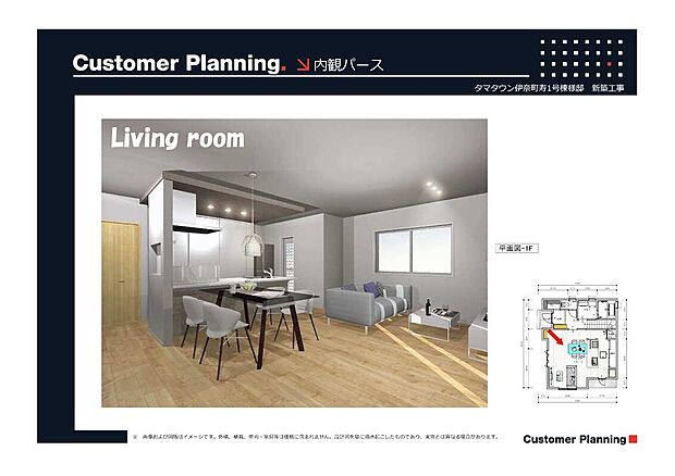 • 【タマタウン伊奈町寿1号棟内観イメージ】流行りのカラーに1階にはグレードアップの幅広のフローリング材を使用しております。収納内部にも棚を完備!