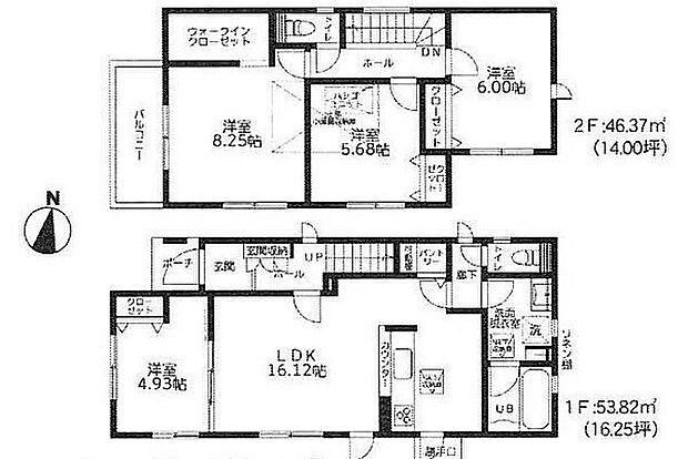 | 間取り | 4LDK 間取り内訳:洋室 5.2帖(1階)・リビングダイニングキッチン 11.3帖(1階)・洋室 5.7帖(2階)・洋室 6帖(2階) |