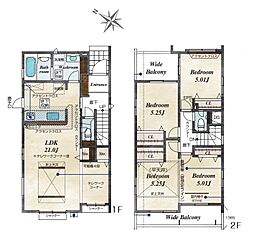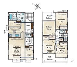 | 間取り | 4LDK 間取り内訳:リビングダイニングキッチン 23帖(1階)・洋室 10帖(2階)・洋室 5.2帖(2階)x3 |