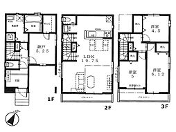 間取り内訳:リビングダイニングキッチン 18.7帖(2階)・洋室 6.5帖(3階)・洋室 5帖(3階)・洋室 4.5帖(3階)・収納 5.2帖(1階)