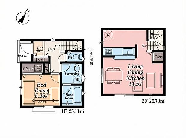 | 間取り | 1LDK 間取り内訳:洋室 5.2帖(1階)・リビングダイニングキッチン 14.5帖(2階) |