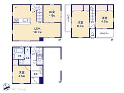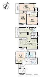 間取り内訳:洋室 4.5帖(1階)・リビングダイニングキッチン 17.3帖(2階)・洋室 6帖(3階)・洋室 4.5帖(3階)・洋室 5.1帖(3階)