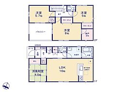 | 間取り | 4SLDK 間取り内訳:リビングダイニングキッチン 16帖(1階)・和室 4.5畳(1階)・洋室 5帖(2階)・洋室 5.7帖(2階)・洋室 8帖(2階)・収納 2帖(2階) |