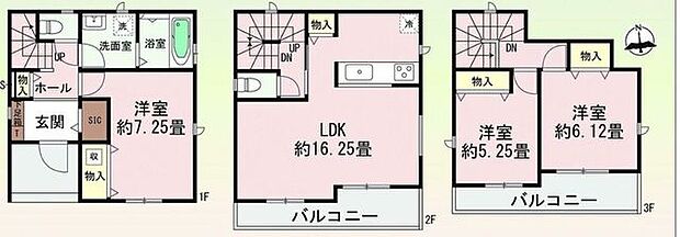 間取り内訳:リビングダイニングキッチン 16.2帖(2階)・洋室 7.2帖(1階)・洋室 6.1帖(3階)・洋室 5.2帖(3階)
