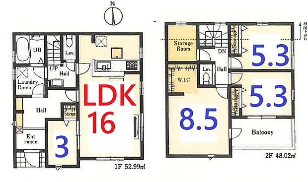 | 間取り | 4LDK(室内干しスペースとファミリークローゼットがあります。) 間取り内訳:リビングダイニングキッチン 16帖(1階)・洋室 3帖(1階)・洋室 5.3帖(2階)・洋室 5.3帖(2階)・洋室 8.5帖(2階) |