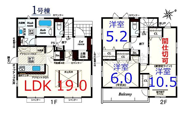 間取り内訳:リビングダイニングキッチン 19帖(1階)・洋室 10.5帖(2階)・洋室 6帖(2階)・洋室 5.2帖(2階)